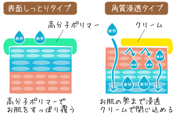 一方、 「表面しっとりタイプ」の化粧水は、水分を吸着した高分子のポリマーで、肌をスッポリ覆って、肌を保護したり、水分蒸発を防いだりするタイプ!